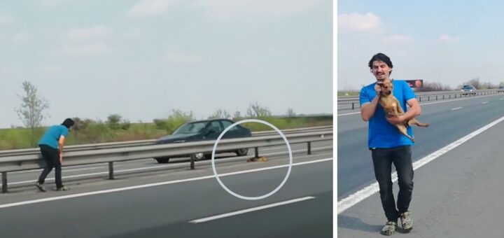 O interveniente das imagens parou em plena autoestrada e aproximou-se, calmamente, do cachorro assustado para lhe salvar a vida.