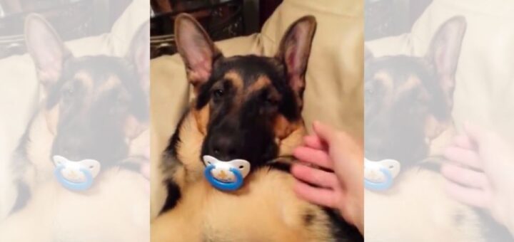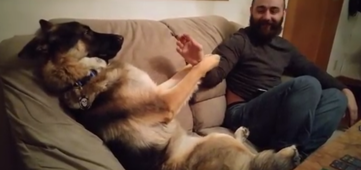 O patudo, deitado no sofá, é tão grande que vê-lo em modo “bebé” é mesmo muito engraçado! Enquanto o dono lhe faz carinhos no focinho, o pastor alemão quase que adormece.