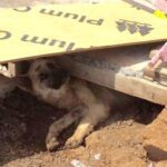 Após uma tempestade, os trabalhadores de uma construção encontraram entre os escombros uma cadela Pastor Alemão.