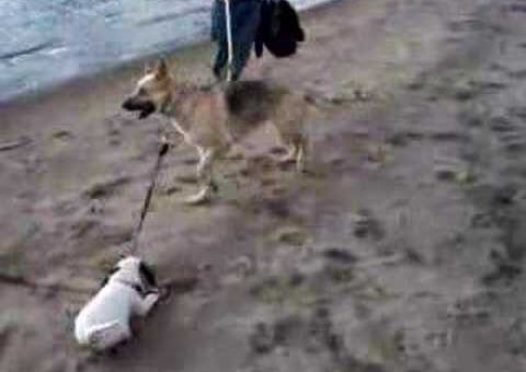 O pequeno pitbull pura e simplesmente é arrastado! lol coitadinho… 🙂 Esse passeio na praia não podia ser mais engraçado!...